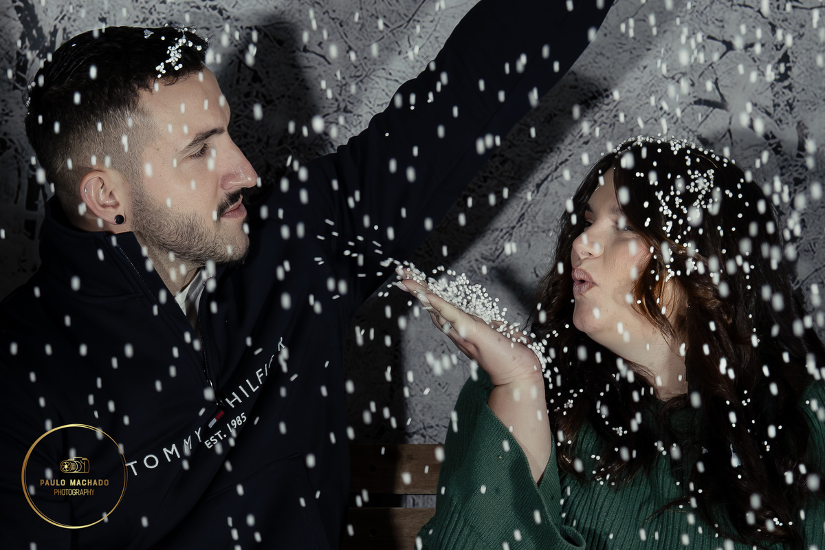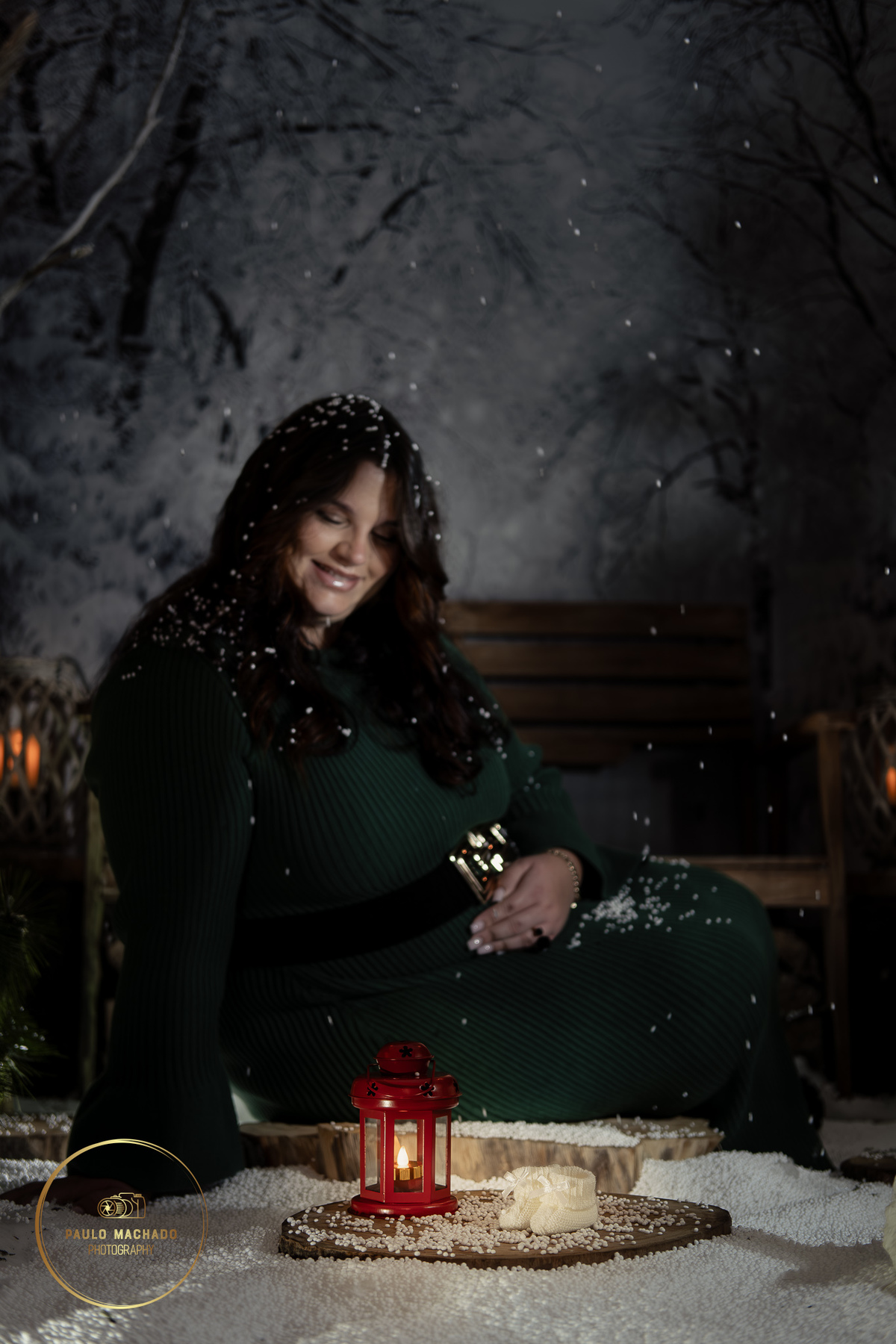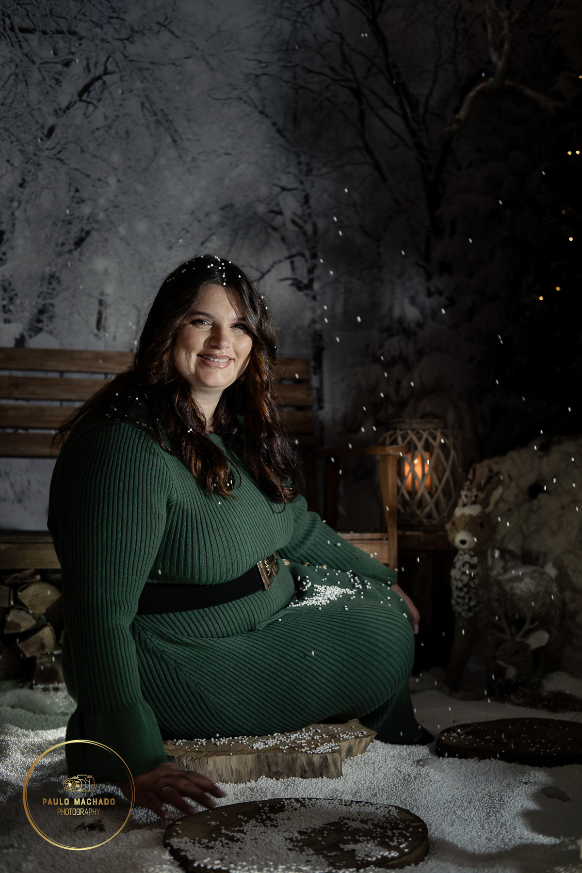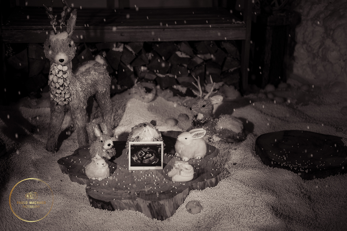 Sessão de Natal 2025 intitulada "Bosque Mágico" realizada em estúdio e desenhada num contexto de Inverno com neve a cair.