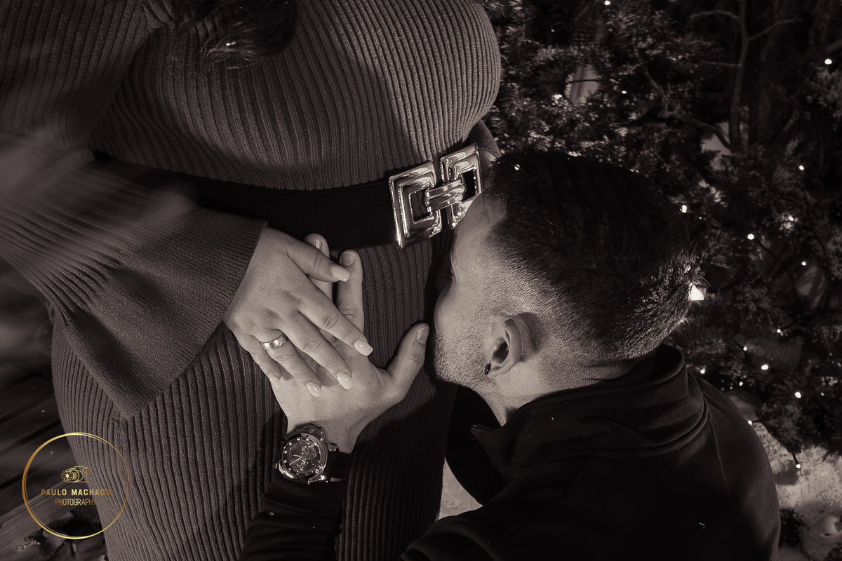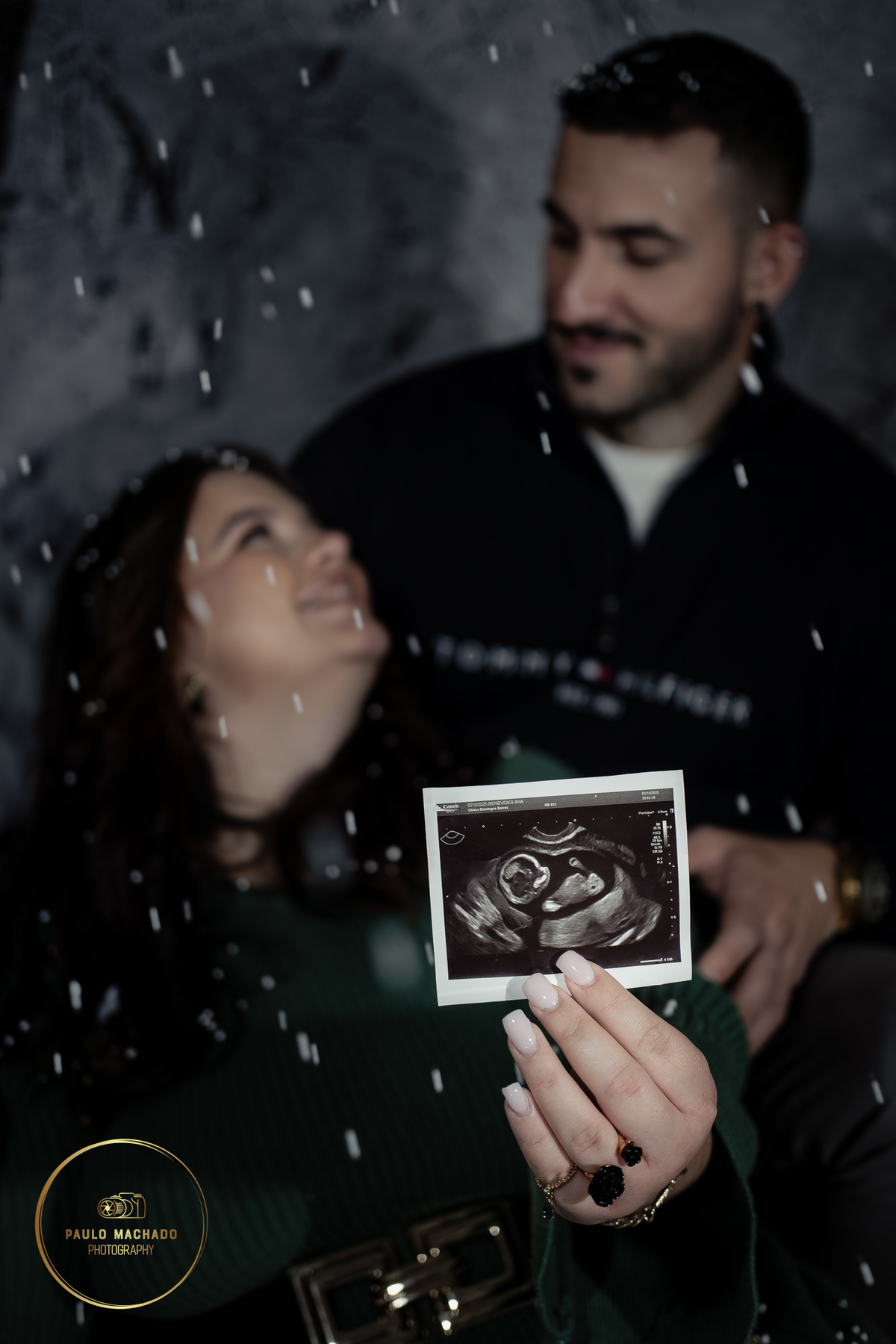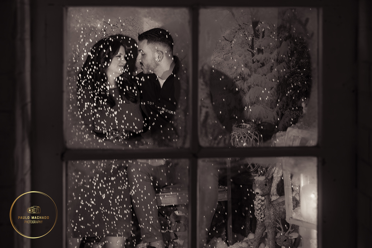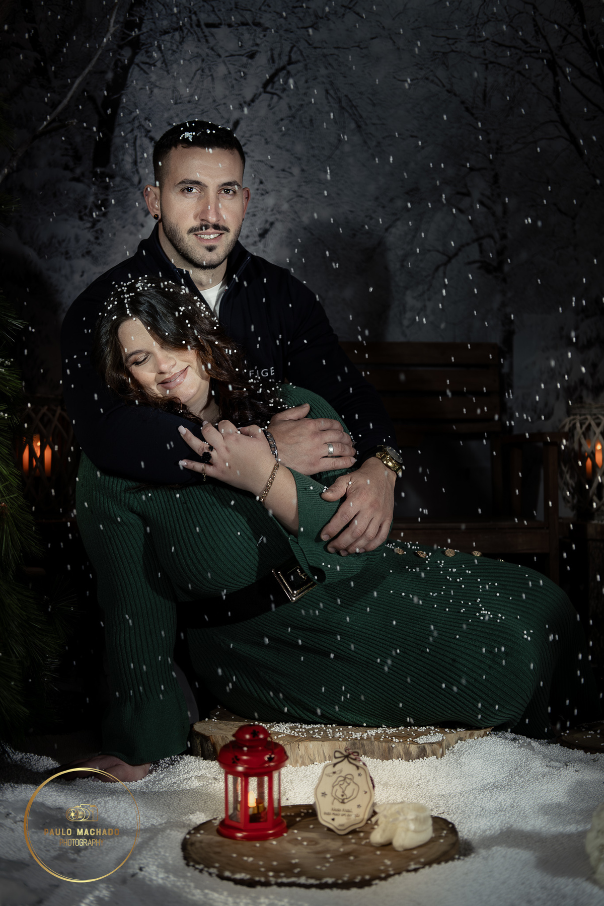 Sessão de Natal 2025 intitulada "Bosque Mágico" realizada em estúdio e desenhada num contexto de Inverno com neve a cair.