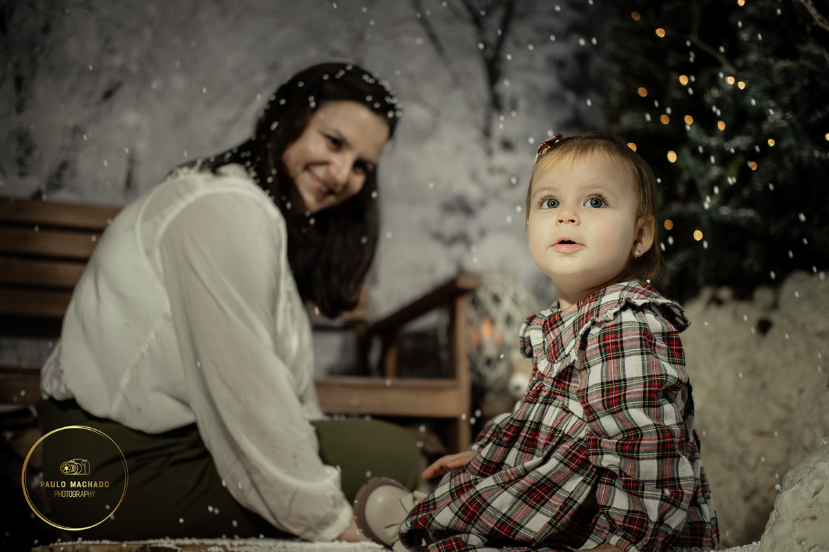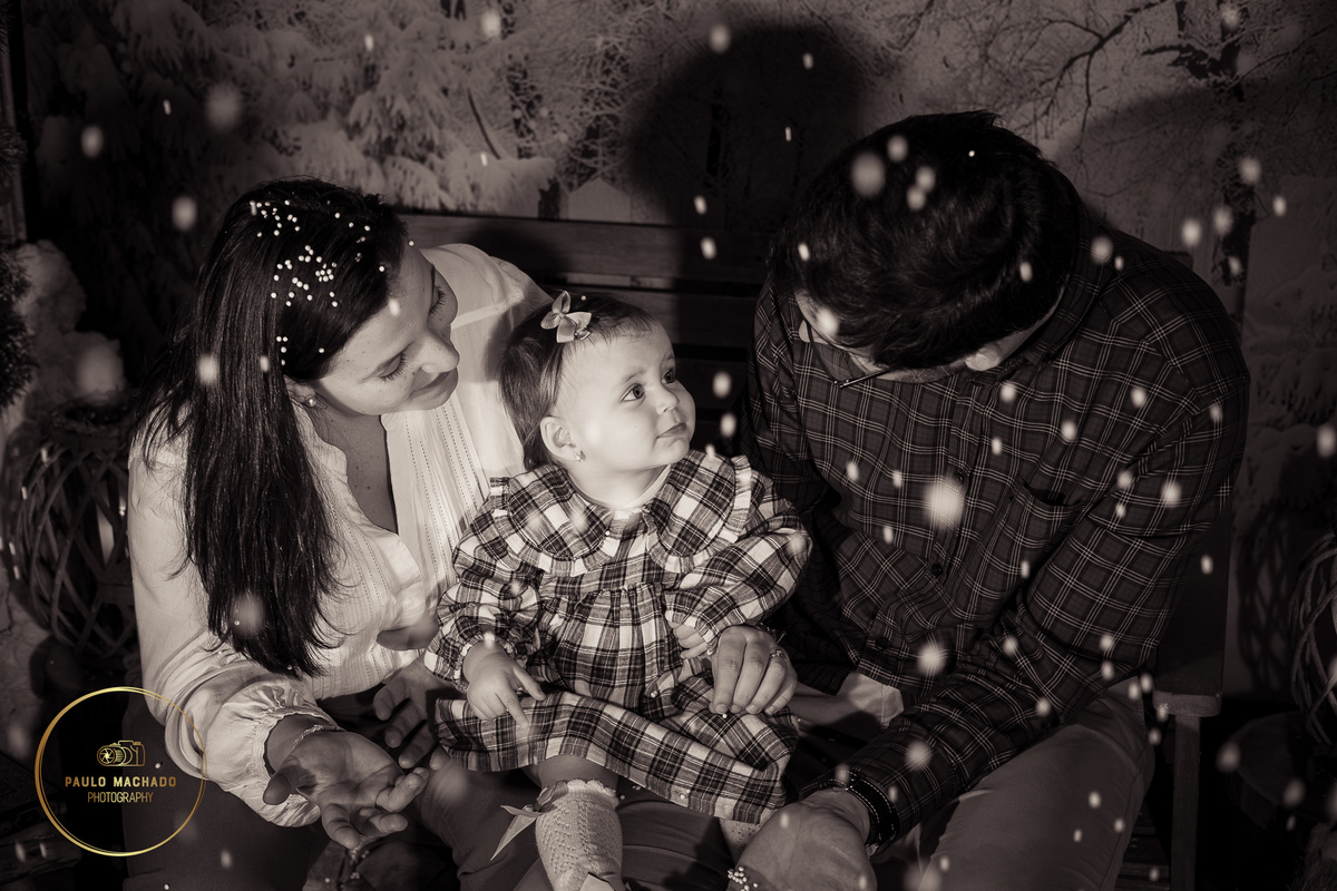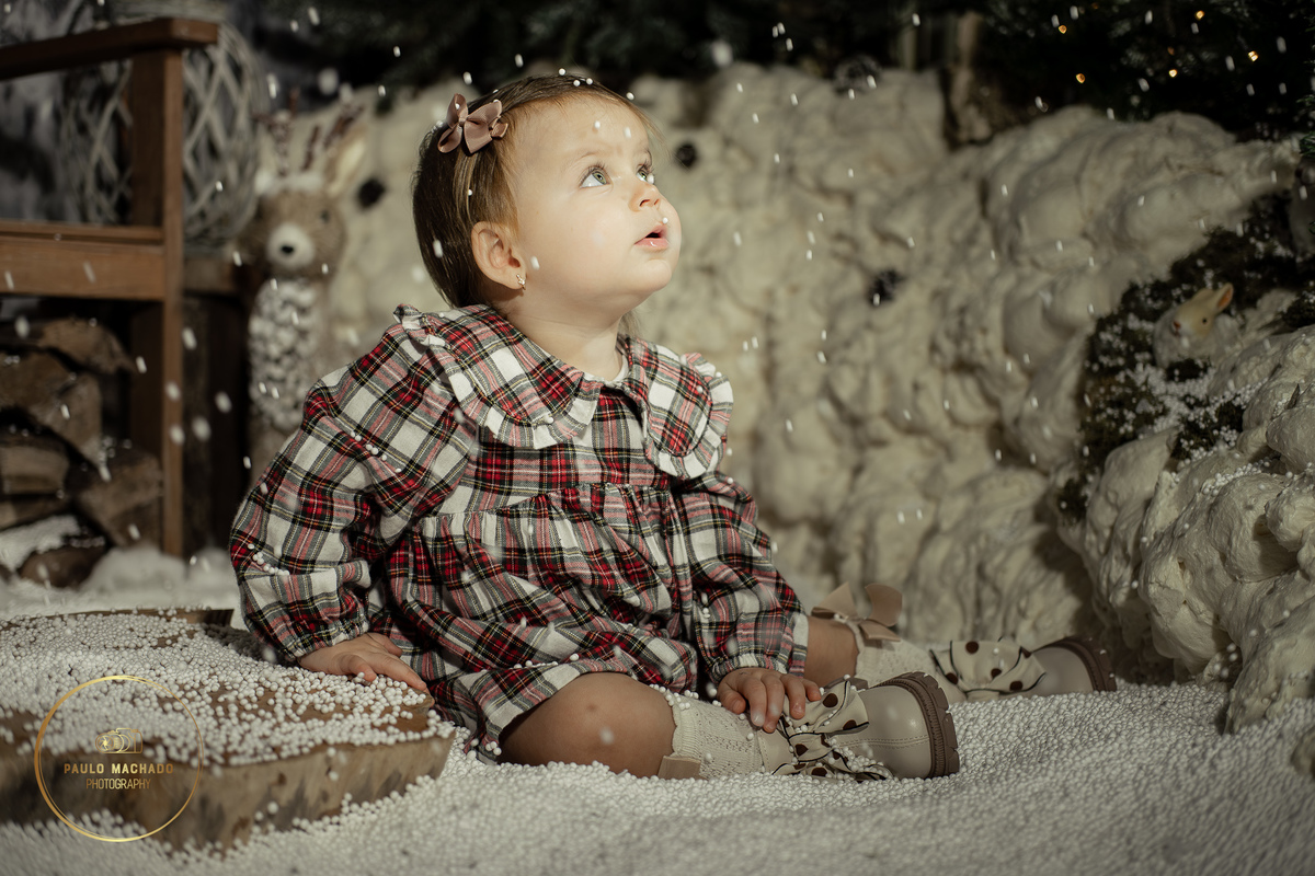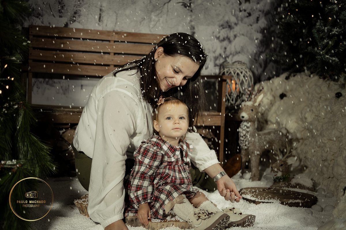 Sessão de Natal 2025 intitulada "Bosque Mágico" realizada em estúdio e desenhada num contexto de Inverno com neve a cair.