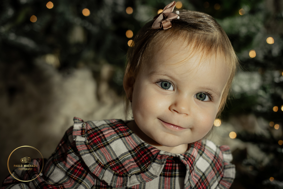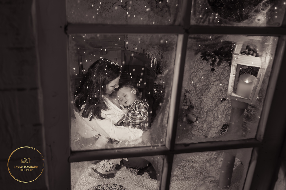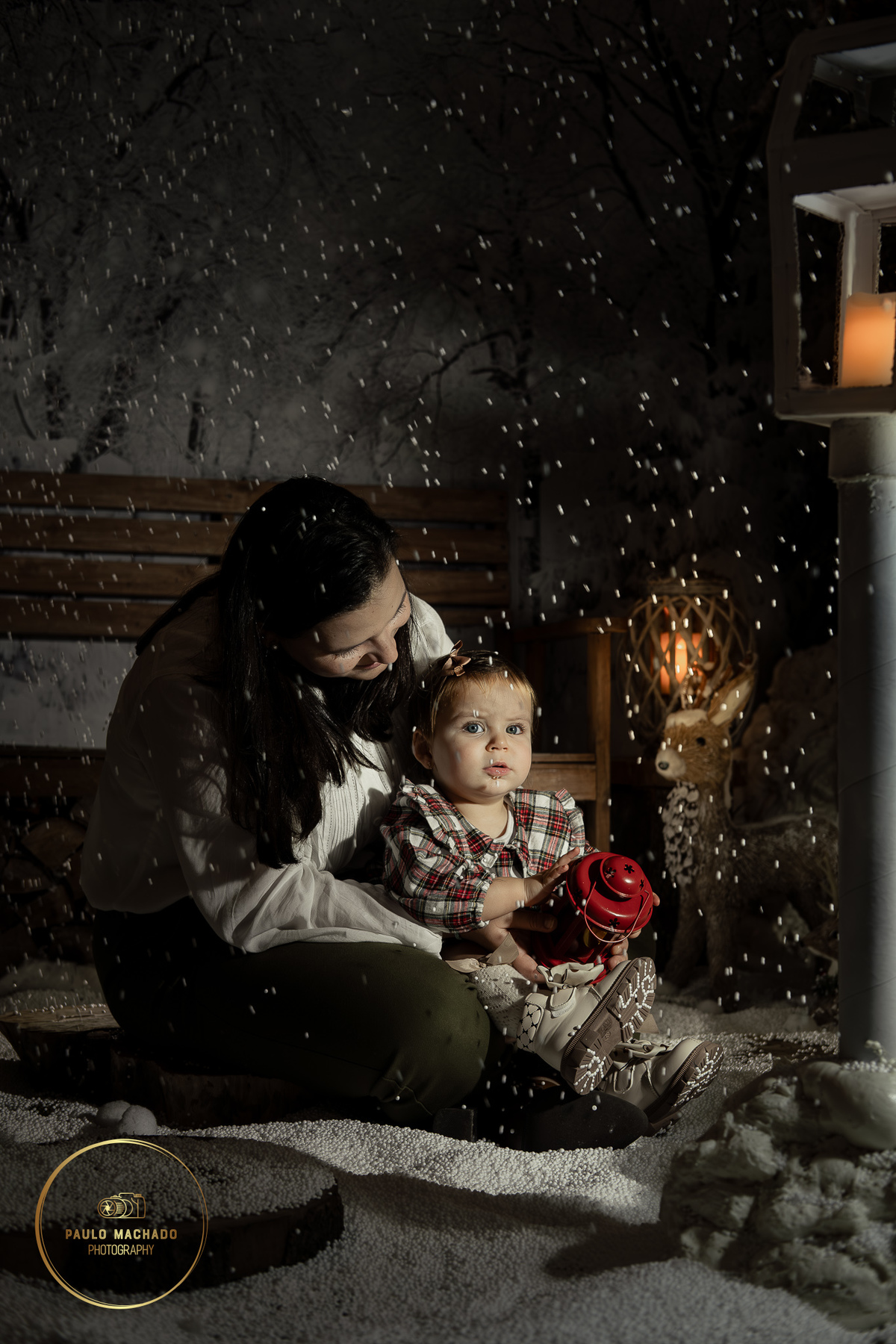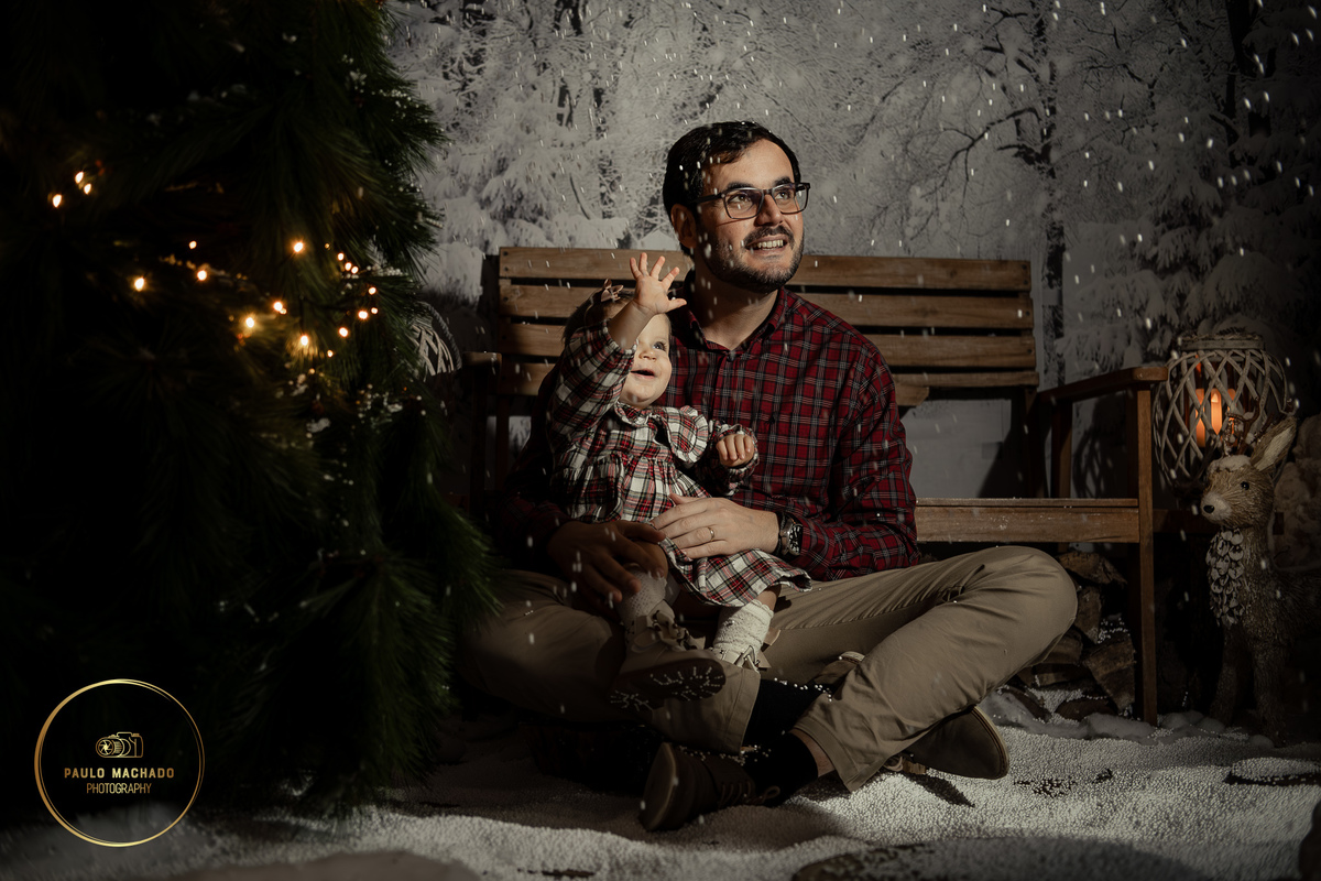 Sessão de Natal 2025 intitulada "Bosque Mágico" realizada em estúdio e desenhada num contexto de Inverno com neve a cair.